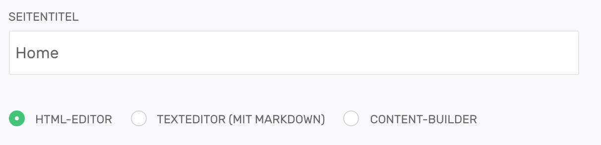 Seiten sind entweder reine HTML-Seiten (wird bei Aufruf der Seite oben nach dem Seitennamen angezeigt) oder können mittels Markdown (MD) oder mit dem Content-Builder erstellt werden. Zur Zeit ist nur die Umsetzung als HTML (alternativ Markdown) in den Webseiten-Templates mit Designvorlagen berücksichtigt.
