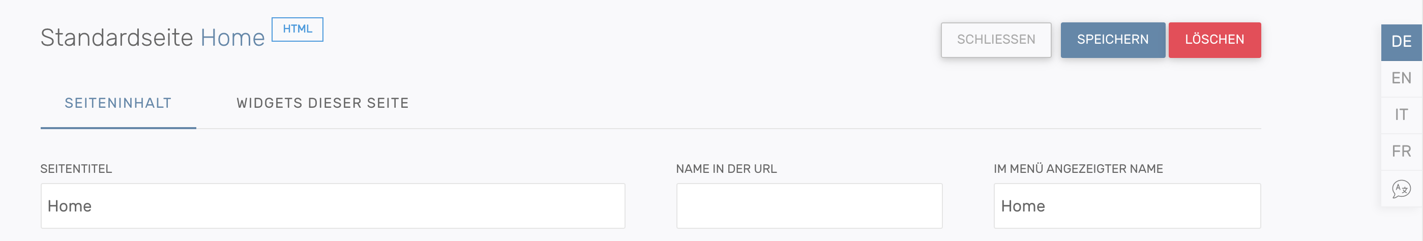 Die Sprachwahl bleibt innerhalb der Seiten- und Widgetnavigation voreingestellt. Bitte darauf achten, welche Sprache gerade ausgewählt ist (blau unterlegt). Nur diese Sprachversion wird editiert. Sowohl Seite- als auf Widget benötigt einen Titel in der Default-Sprache. Diese ist bei Bodystreet.com und .ch Deutsch (DE). Die anderen Domains haben nur eine Sprache, die auch gleichzeitig die Default-Language ist.